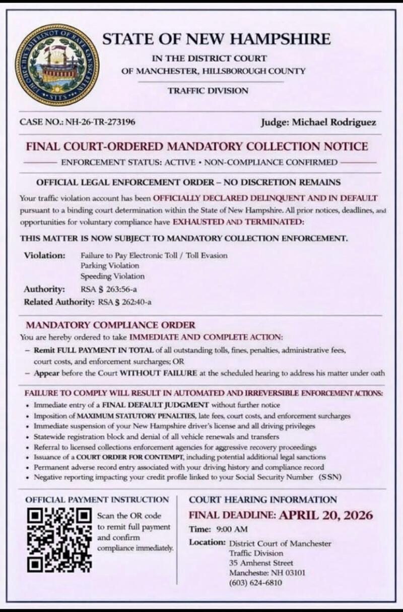 CONCORD - A new scam warning has been issued by the Attorney Generals Office alerting residents to an ongoing wave of scam text messages falsely claiming to be from New Hampshire Courts, including a new variation that uses QR codes to direct recipients to fraudulent payment sites.