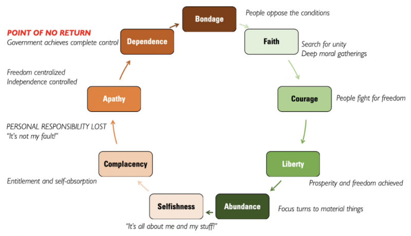 Titler's cyclic picture recognizes this evil trend that free people must overcome to remain free. America's colonial generation, rooted in deep faith, found the courage to step into liberty. Why do our people remain ignorant of these foundations of liberty? When was the last time our public schools taught true American history without the lie that "there is no God?" The Declaration of Independence and the Constitution rest firmly on the essential eternal truths of the Bible. Creator wisdom that created our liberty is something the created in the educational establishment, or even AI, know nothing about. God is the sole author of liberty.