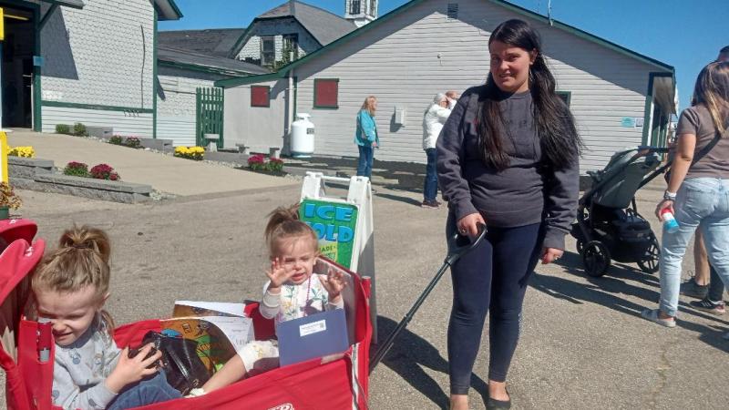 | Jasmine Thatcher of York, Maine, totes a wagon holding her children, Lincoln, 4, left, and Rayne, 2, at the Granite State Fair on Saturday. |