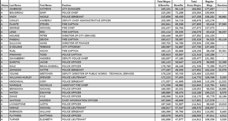 The top 10 employees in total wages and benefits for last year include City Manager Katie Ambrose at 245,101, Police Chief Gary Boudreau at $225,293, Polce Sgt. Nicole Knox at $215,659, Dept Chief Administrative Officer Kimberly Conley at $203,395, Fire Capt. Steven Plante $202,941, Fire Chief Michael George at $202,437, Fie Captain Eric Lenzi at $201,114, Director of City Services Peter Nourse at $194,449, Fire Capt. Devon Pageau at $193,417 and Director of Finance Mark Sullivan at $190,702.